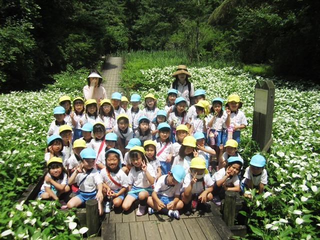 池の中に敷かれた橋を渡っていくとそこには、美しい半夏生の花が群生していました。今が丁度見頃です。半夏生に囲まれ、みんなで記念撮影をしました。