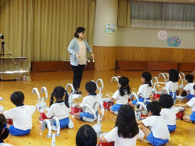 「ト・ト・トマト」「ア・イ・ス・ク・リーム」とリズムを言葉で唱えながら打ちます。ひとりでは出来てもみんなで揃えることが難しい。「音を良く聞いて」の声に、友達のリズムにも耳を傾けます。