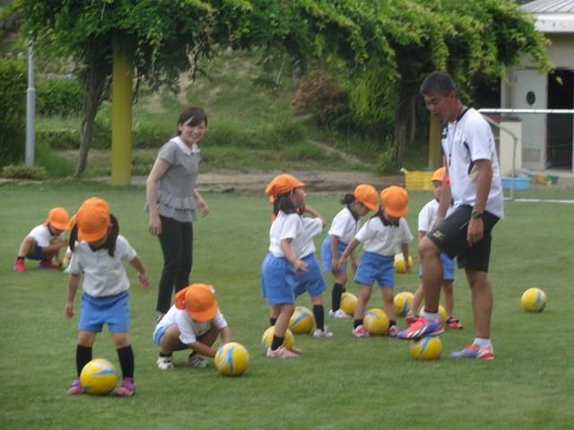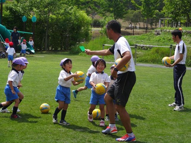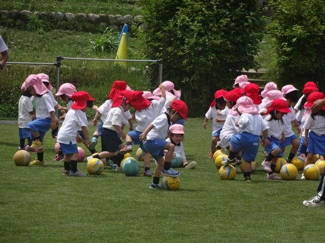 年少組は、初めてのサッカーです。2クラス合同で、たくさんの人数でしたが、みんなM先生のおっしゃる話を良く聞き、ボールと戯れていました。グリーンカードが出ると、とっても嬉しそうな笑顔をみせてくれました。