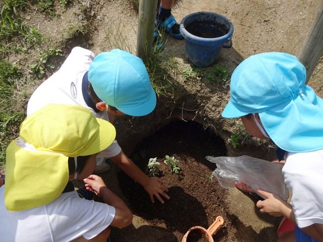 「私、水汲んでくる」と、ちゃんと水もあげていました。Fくんは、落果した小さな柿の実を植え「あ~いつになったら柿できるかな」と何度もつぶやいていました。「種じゃないから芽はでないよ」とは決して言いません。体験して感じ,自分で考えようとすることを大事にしたいからです。子どもから「どうしてかな」と言ってきた時には、一緒に考え知的好奇心を揺さぶるようにしています。