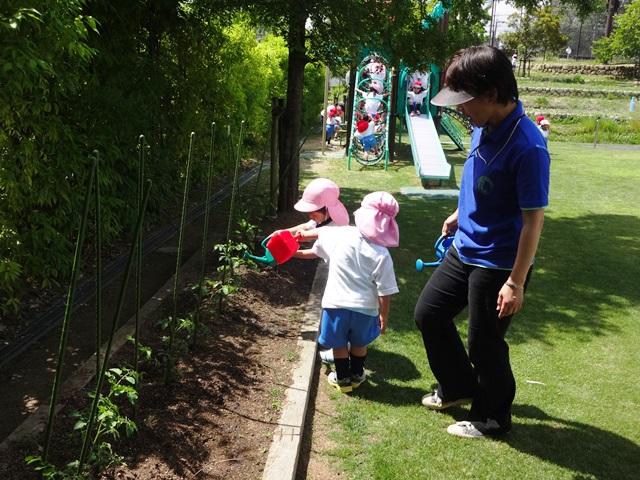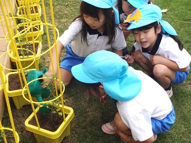5月の下旬に夏野菜の苗を植えました。年長組は、一人一鉢栽培で、ミニトマトの苗を植えました。「大きくなってね」と収穫を楽しみにしながらお世話をしています。