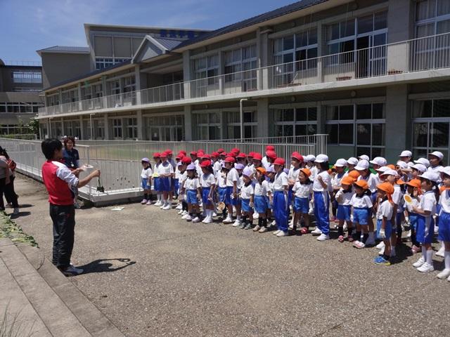 ペアを組んだ小学生に手を繋いでもらって整列した園児は、ちょっぴりドキドキ… でもお兄さん・お姉さんが優しくしてくれるので大丈夫☆ 先生から苗の植え方についての説明を一生懸命に聞いていました。