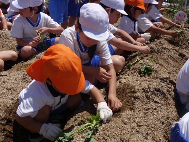 事前に小学校の教員と幼稚園の教員で耕した畝にさつまいもの苗を植えます。「これを植えて、どこにおいもができるのかな…」園児はそんなことを考えているように感じました。
