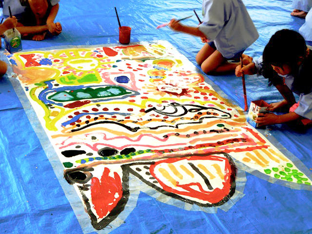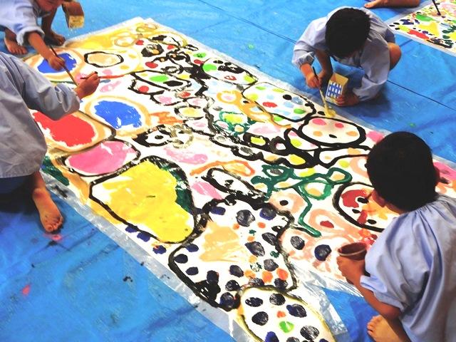 真っ白な紙に、友達と一緒に好きな模様を描いていきます。どのグループの子も夢中です。それぞれの感性で心の赴くままに思いっきり筆を走らせています。見ていてとてもおもしろいです。