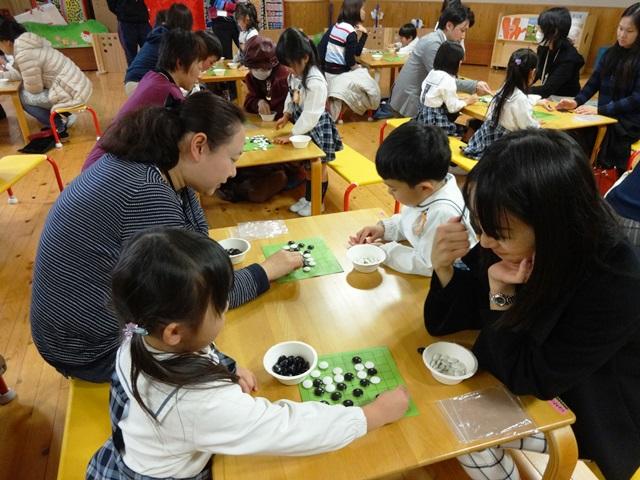 いよいよ親子で対決です。みんな真剣に取り組みます。碁盤の上の碁石を見つめながら攻めたり取ったりして喜んでいました。保護者の方より石をたくさん取ったとにこにこ笑顔で喜ぶ姿もみられました。
