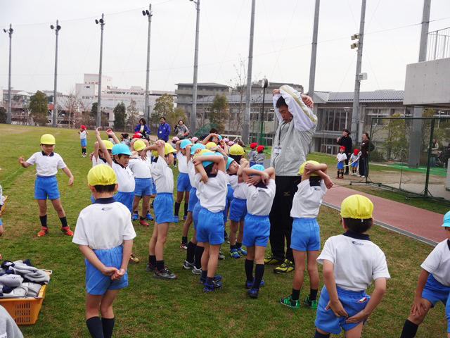 年長組は走りたい意欲満々! 三苫先生とウォーミングアップをして、ベストコンディションに調整!