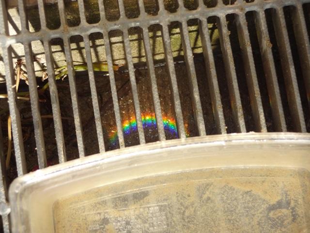 子どもたちの心も不思議・発見で揺れていました。私はこの現象を見て、”プリズム”を思い浮かべました。この日は、いい天気。水の入った水槽がプリズムの役割を果たし、太陽光線が水槽を媒体に分散され虹が映し出されたのではないかと思いました。