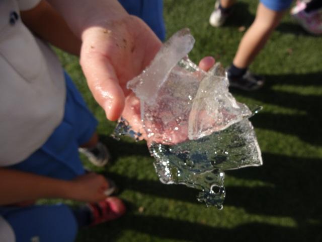 「氷!冷た~い」と見せに来る子どももいます。冷たくて、手が真っ赤になっていました。それでもへっちゃら。氷集めに夢中です。