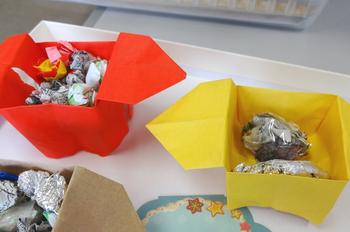 朝、子どもたちを迎えて、職員室に戻ると贈り物が置かれていました。折り紙で作った三方の中に入った紙を丸めた豆!