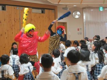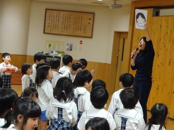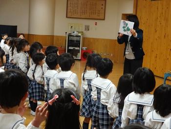 集会では、このプレゼントも使いながら、節分の日の由来を話しました。「新しい春を健康で幸せに過ごせるように、みんなの心の中にいる弱い鬼(泣き虫鬼、おこりんぼ鬼、いじわる鬼、片付けられない鬼等…)を追い払いましょう」そしてもう一つ、ひいらぎの小枝に鰯の頭を挿した「やいかがし」の話をしました。