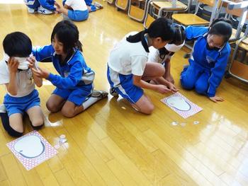 P3の教室には、福笑い・カルタ・こま・けん玉・あやとり・おはじき・ゴム跳びの場が用意されていました。どの遊びも私が子どもの頃に楽しんだ懐かしい遊びです。ゴム跳びもおはじきもあやとりもカルタも子ども時代に遊んだ情景が一緒に遊んだ友達や家族の顔と共に蘇り、不思議な感情に包まれました。