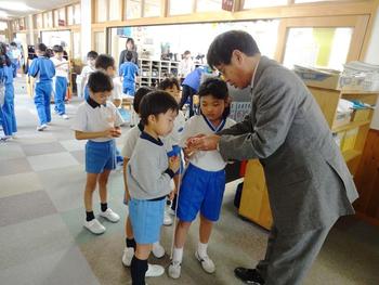 こま回し名人の教頭先生のすご技に、子どもたちが集まります。ひもの巻き方から教えていただきますが、思うようにできません。