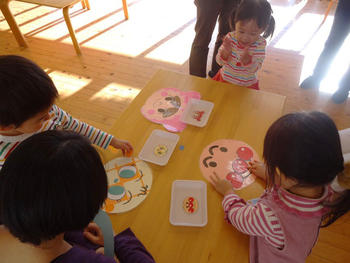 2歳のいちご組では、福笑いをしていました。2歳児の子どもたちが大好きなアンパンマンシリーズ♪ 「目・眉毛・鼻」と並べていきます。全部並ぶと先生がにこにこ笑顔で「すごーい」と拍手をして褒めてくれます。それが嬉しくてまたがんばるいちご組さんです。