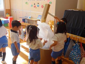 年中組では、牛乳パックの底の部分を切て”こまづくり”好きな色で着色し、真ん中に爪楊枝を挿して回します。「回った」「きれい」「不思議まるくなってる」遊びながら科学の不思議を感じています。