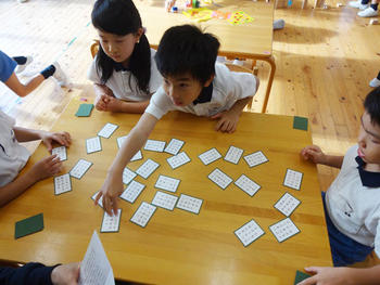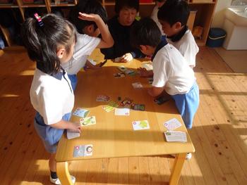 年長組では、百人一首を楽しんでいました。先生が読み手になり、子どもたちがとります。家庭でも楽しんでいたのでしょうか、上の句を読むだけで下の句がわかり一生懸命に探す姿もみられます。