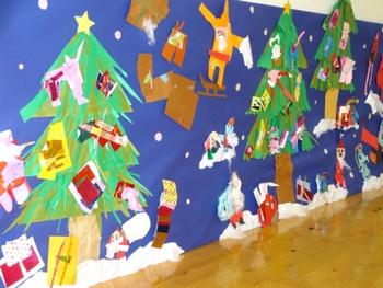 12月は子どもたちの心がワクワクする月♪ 園の玄関では、3歳児が創ったツリーやサンタクロース、トナカイがみんなを迎えてくれています。一人一人の作品は幼さがみられますが「サンタさん来てくれるかな♪」と願いながら一生懸命つくりました。できた作品を壁面に構成していくと素敵な夢の世界が広がりました☆