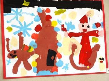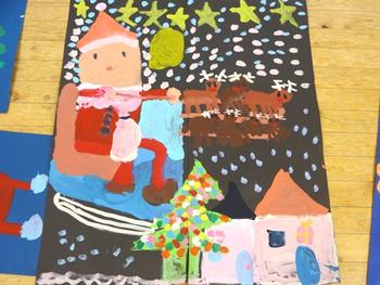 5歳児の保育室にもサンタの絵が掲示されていました。5歳児になると”見る力”も育っています。家もツリーもソリに乗るサンタの姿もしっかりと捉えています。四つ切り画用紙を4枚繋げのびのびと描きました。