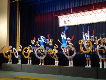 次にリングとフラッグで登場したのが年中児。リングを回す手、フラッグを上げる手、どの子も一生懸命でした。年少の時から憧れていたフラッグ♪ たくさんの観客の前でも堂々と演技出来るようになりました。