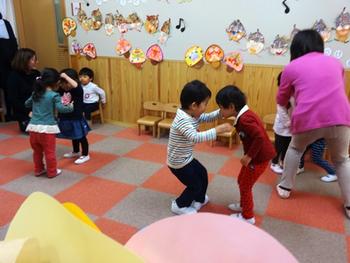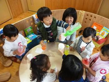 お部屋では友達と関わることが嬉しく、一緒にごっこ遊びを楽しむ姿もみられます。「どのジュースにしますか」「メロン」「オレンジ下さい」「ピーチ」と好きなジュースを紙コップに入れてもらいます。Hちゃんの「乾杯しよう」のかけ声でみんなで「カンパーイ♪」 友達と心を合わせ同じ思いで遊びを楽しむことができるようになってきたいちご組の子どもたちです。友達がいるから♪楽しい遊びができるから♪ 幼稚園に来ることが楽しいと思えるようになってきたこの頃です。