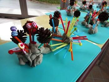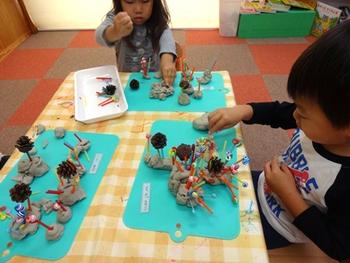 紙粘土や油粘土を土台にして、いろいろな素材や松ぼっくり等を挿して好きな物を創りました。