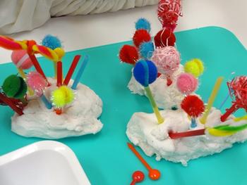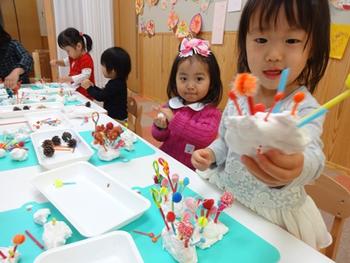 まるでキャンディーのようにカラフルな素材に心を惹かれ、「ケーキつくってるの」「いっぱい!見てみて♪」とケーキ作りを楽しむ子、粘土をちぎって固めたベースに松ぼっくりや自分のお気に入りの素材を使って黙々と取り組む子。「わー素敵」と声をかけると、にこにこ笑顔で「ジュラシックワールド♪」と応えてくれました。おそらく初めからそんなイメージをもって取り組んだのではないでしょう。いろいろな素材をくっつけていくうちに、自分の大好きな恐竜の世界を想像したのでしょう。