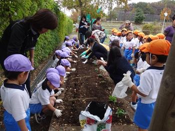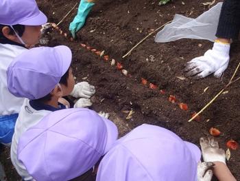 お母様が掘って下さった長い溝。「ここに赤い球根さんを並べてね。」「順番にね。」「そうそういいよ。」子どもたちはお母様の言葉をよく聞いています。球根が一列に行儀良く並びました。「じゃ今度は、土のお布団かけてあげてね。」土をかぶせるとおもしろいのでしょうか。トントンと土を固めている子もいます。「痛いよ。痛いよって球根さんの声が聞こえるよ。」というとすぐに土をほぐして柔らかくする子ども達。幼児期の子どもの心は本当に素直なんですね。