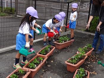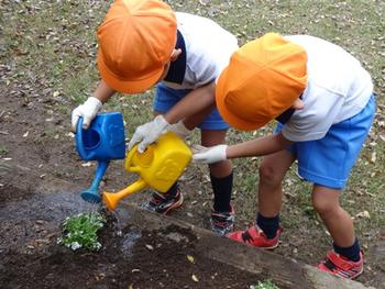 植えた後は、如雨露で水をあげます。「大きくなってねって声をかけてあげたらグングン育つんだよ。」と言うと、「大きくなってね。」「綺麗にさいてね。」という声があちらこちらから聞こえてきました。大人にとっては”たかが球根、でも子どもにとっては”されど球根”球根を植えるにも幼児にとって大切な意味があるのです。植物の生長を知ることはもちろん、大人の言葉かけ一つで優しい心も育つのですね。