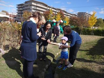 一行はその後、施設を見学。園庭に出て、棚田も散策して下さいました。棚田でドングリを拾っていたもんちゃんは、拾ったドングリをお客様に1つプレゼントしました。