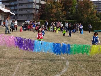 プログラム1番は「かけっこ!ゴールでタッチ」色別のビブスをつけ、レインボ-のゴールを目指して走ります。一人で走る子、おうちの方と手をつないで走る子…みんなゴールまで走りきり、ゴールで待っていた私にタッチしてくれました。