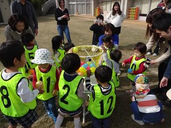 プログラム2番は「玉入れたくさんいれましょう」幼稚園には、運動会でお馴染みの玉入れかごと高さ45㎝くらいの低床玉入れかごがあります。低床かごは、低年齢の子どもたちにピッタリ♪拾っては投げ、拾っては投げ、みるみる間にかごの中はカラフルなボールでいっぱいになりました。