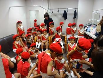 ホールに到着すると、早速衣装に着替え、リハーサルにはいりました。初めての広い舞台にちょっぴり緊張感が漂います。マーチングの指導者の幡井先生も駆けつけて下さり、初めての舞台でのリハが始まりました。