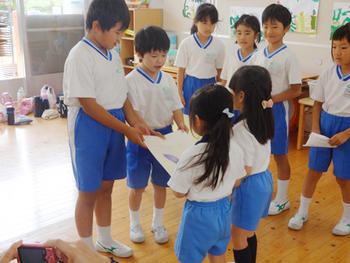 P2生(小2)のおにいちゃん・おねえちゃんは今日の交流のために手づくりの紙芝居やペープサート、クイズなど準備してくれました。さすがP2です。創意工夫がいっぱい!園児に分かりやすくはっきりとした言葉で伝え、演じてくれました。