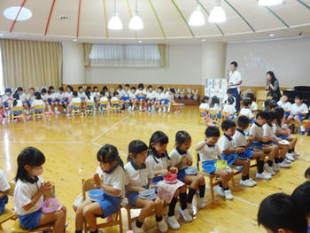 その後、全員が遊戯室に集まり、みんなでおいもをいただきました。少しずつではありましたが、みんな「おいしいね」といいながら食べていました。
