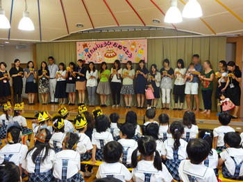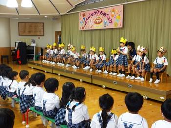 9月11日、8月9月生まれの子供たちを祝う誕生日会を行いました。誕生会には誕生児のお母様・お父様にも園にきていただき、共にお祝いをしていただいています。生まれた時は腕の中に入るくらい小さかった子が、今では幼稚園に通い友達や先生と元気に遊ぶようになりました。また1つ大きくなった喜びをみんなで「おめでとう」ってお祝いしたいと思い保護者の皆様にも共に祝っていただく誕生会を催しています。