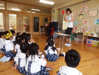 毎回、私からもお祝いのプレゼントをします。今回は「新聞シアター」をしました。新聞紙で船を作って宝島に行くという内容です。でも途中、嵐に遭い船が岩にぶつかり壊れてしまいます。遭難した(破れた)船を広げるとTシャツに・・と話を進めとうとう宝が見つかるというシアターです。新聞紙がいろいろな物に変わって行く様子をみんな喜んで(と思います)見てくれました。
