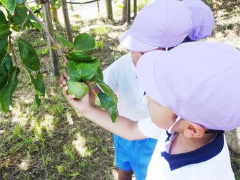 年中組に行くと、H君が「先生柿、出来てるねん。来て、来て~」子どもに手を引かれていくと柿の実がたくさん結実していました。