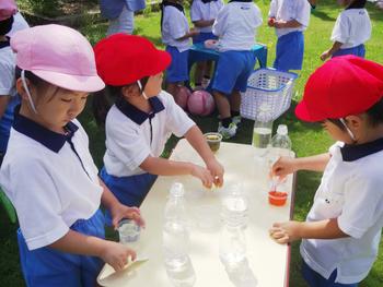自由遊びでは、水にカラークレープ紙を入れ「色、出たー」「不思議やな!」「もっとしよう」と繰り返し試して遊びます。