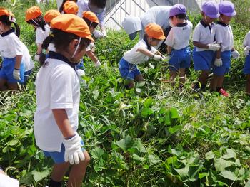 今日は、みんなで草引きです。暑くて汗がいっぱい出ましたがどの子も一生懸命頑張りました。「大きなお芋が出来るかな?」収穫を楽しみに待つ年中児です。