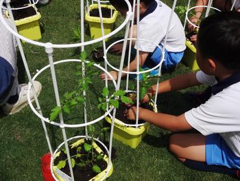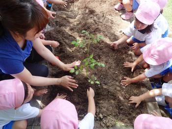 年少組は、みんなで畑に”トマトの苗”を植えました。”土のお布団ですよ”と小さな手でそ~っと土をかけ、トントンと優しく押さえます。「大きくなってねトマトさん♪」どんな実がなるのかとっても待ち遠しい子供たちです。