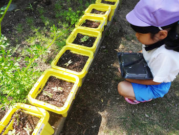 年中組は、夏の定番”朝顔の種まき”をしました。土の中で眠っていた種からかわいい芽がヒョッコリ♪。どの鉢からもヒョッコリ、ヒョッコリ♪ みんな2粒植えたはずなのに「あれ?」3つ芽が出てる子、4つの子どうしてかな……?