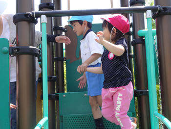 大好きな大型遊具を自分の力で一生懸命登ります。「ちょっとこわいな~」と思っていると年長組のお兄ちゃんが来て手をつないでくれました。