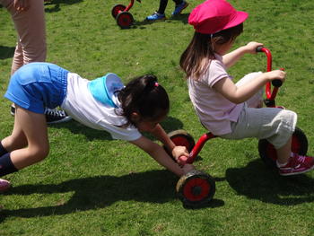 その姿を見た年長の女児が走ってきて後ろから押してあげます。「走る走るルンルン♪」です。