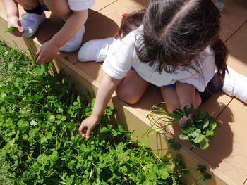 「先生見て、四つ葉見付けた」「私3個も見付けたよ」夢中で四つ葉のクローバー探しをする5歳児の子どもたち。