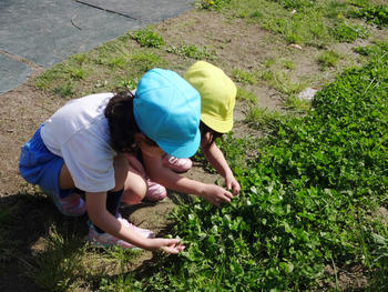 3歳児も保育室のデッキの前に広がるクローバーを一生懸命集めていました。