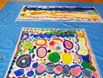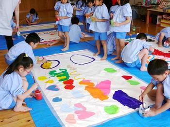 年長組の子どもたちが、大好きなアートに取り組みました。大きなベックス紙に色とりどりの絵の具を使って、大胆に描きます。