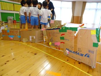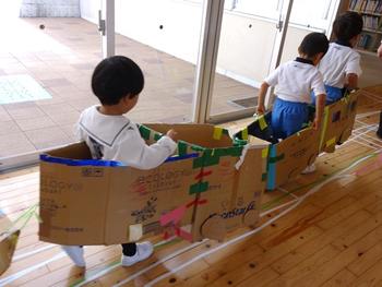 線路ができると電車づくり☆段ボールを連結し、車輪をつけたり、運転席を工夫したり、自分のイメージを広げながら創ります。友達の思いにも触れることでより本物らしくしようとする姿がみられます。