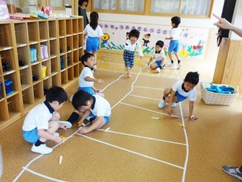 廊下では、5歳児がビニールテープを使って電車の線路を繋いでいました。友達と力を合わせ、保育室から玄関まで続けます。その姿は、真剣・夢中! それを見つけた4歳児・3歳児が嬉しそうに線路を走ります。もちろん5歳児は、何も言わず優しく見守ってくれています。さすがお兄さん☆☆