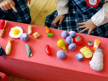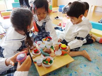 保育室では、楽しい自由遊びが広がります。3歳児クラスのままごと遊びに参加すると、テーブルの上には、ごちそうがいっぱい。