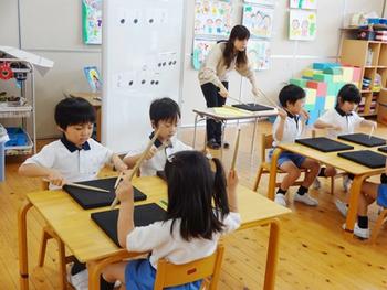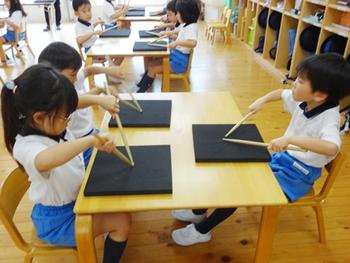 次はバチを持ってリズム打ち「♩♩♫♩」「ト(右手)ト(右手) ト(右手)マ(左手)ト(右手)」慣れないバチですが「トは右手よ。マは左手。」と教えていただくとトマトの言葉に合わせて、どの子もリズムをマスターしていきます。出来たことが嬉しくて、褒めていただくのが嬉しくて頑張る子どもたち。最後に「さんぽ」の曲に合わせて今日習ったリズムを打ちました。