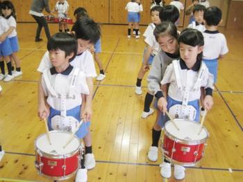 過日、もうすぐ卒園を迎える年長児から年中児へとマーチングの引き継ぎ式を行いました。年長になったらできると憧れの気持ちを抱いていた年中児は、今日、幡井先生の指導のもと初練習を行いました。バチを持つのが嬉しくてたまらないといった表情の子どもたちは、始めに幡井先生から「テンハット」「レディートウ」を教えていただき耳と心を集中します。「上手にできたね。」の言葉にさらにやる気が出てきます。